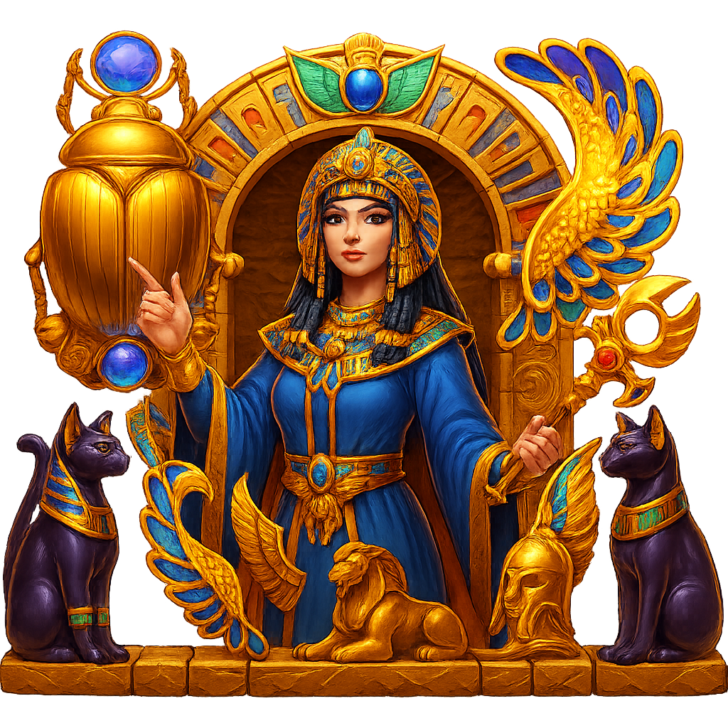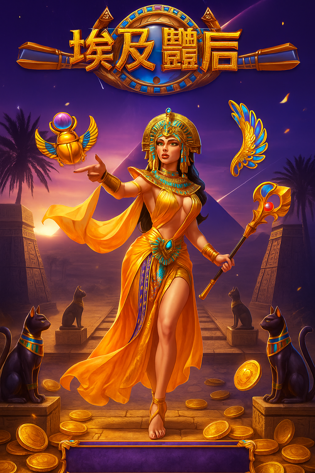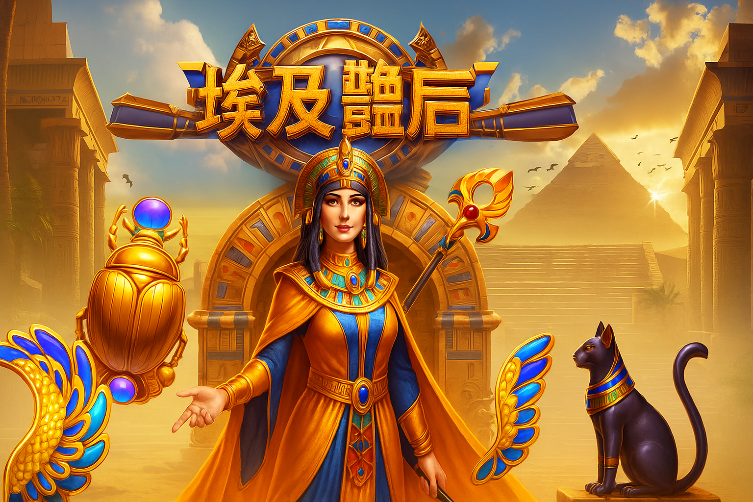 《埃及豔后》是一款以古埃及文明與豔后傳奇為主題的電子老虎機,遊戲畫面充滿金字塔、法老面具、荷魯斯之眼與神秘符文,視覺風格華麗神祕。玩家將跟隨美麗而致命的女王展開尋寶之旅,從神廟中挖掘黃金寶藏、揭開命運的轉輪。