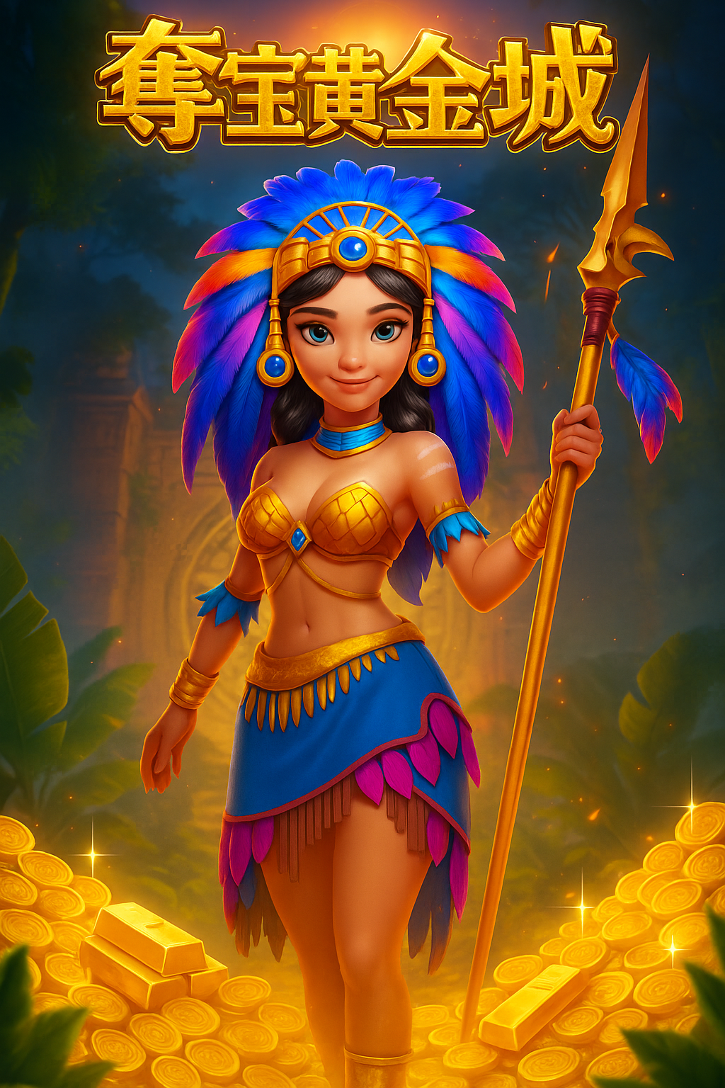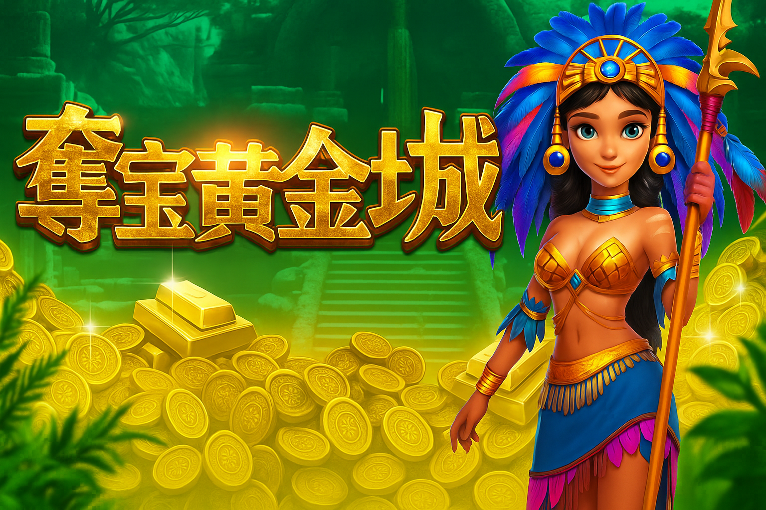 《奪寶黃金城》是一款融合古文明遺跡與黃金財寶元素的冒險型電子老虎機,背景設定在神秘的印加金字塔遺址,由羽飾戰士女主角領軍展開尋寶任務。大量金幣、金條與圖騰圖示搭配 SCATTER 和 BONUS 特效,讓你在轉動之間體驗熱血刺激的奪寶旅程。